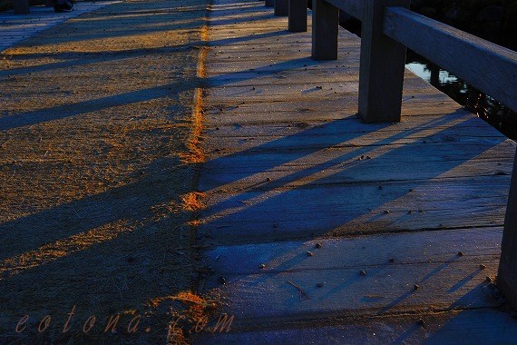 構図に雪吊を入る想定だったが無理、日の出に紅く染まるベンチをとらえる。