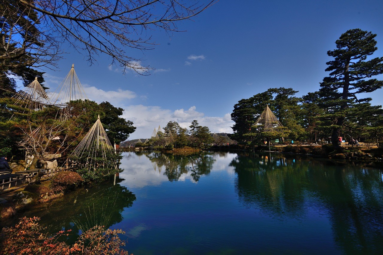 兼六園17世紀中期、加賀藩により金沢城の外郭に造営された藩庭を起源とする江戸時代を代表する池泉回遊式庭園。