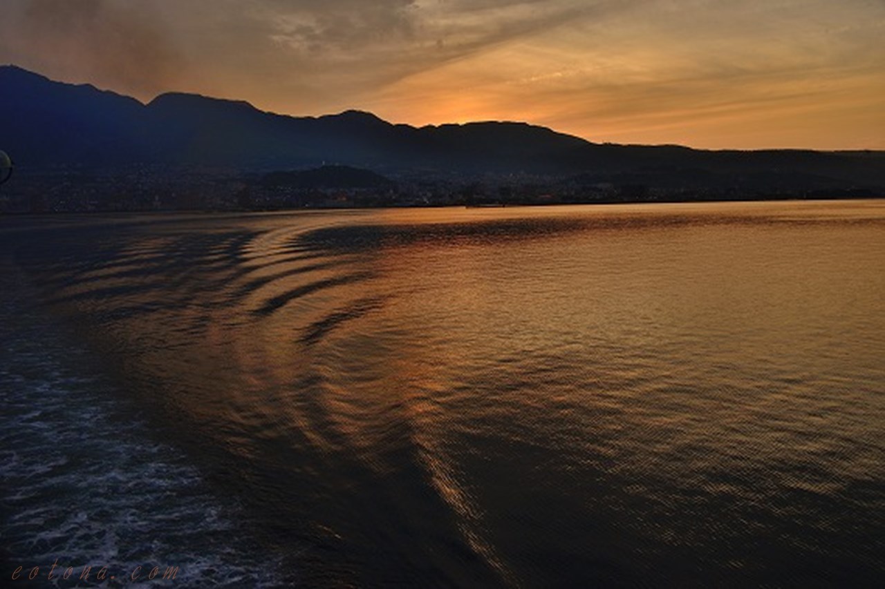 別府港で夕日の時刻に乗船したが、ここも山が目の前に迫り、撮影の立地はよくない。