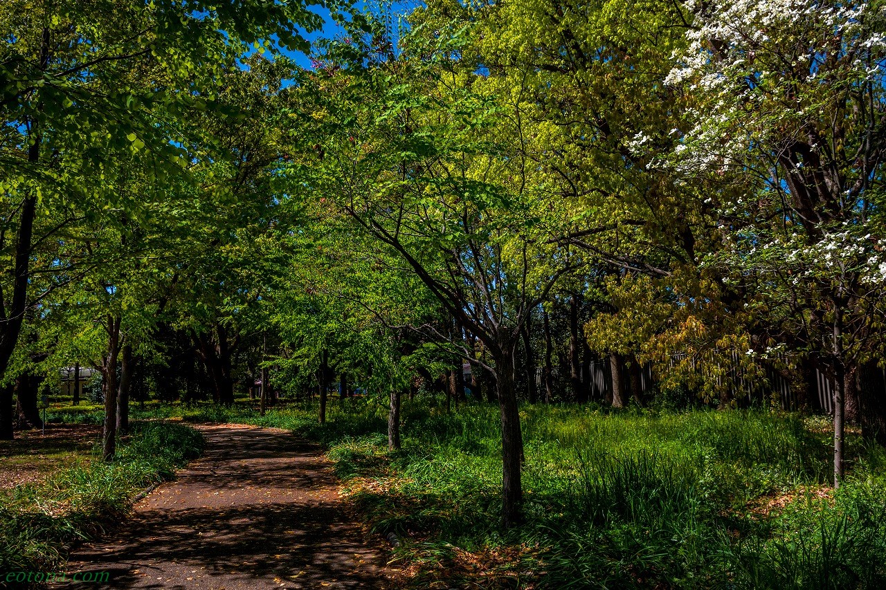ミドリが濃くなり、中にハナミズキの白が目立つ。