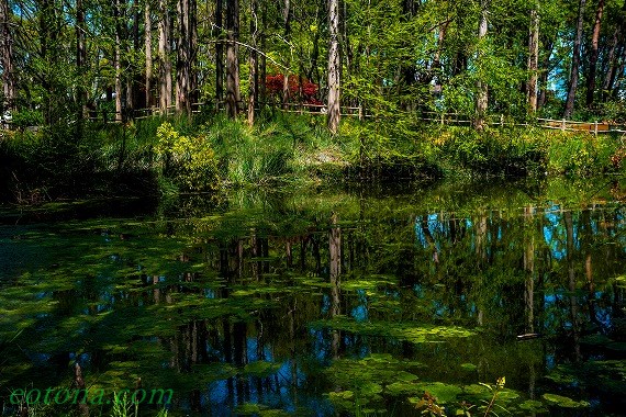小池に移り込むメタセコイヤの林。