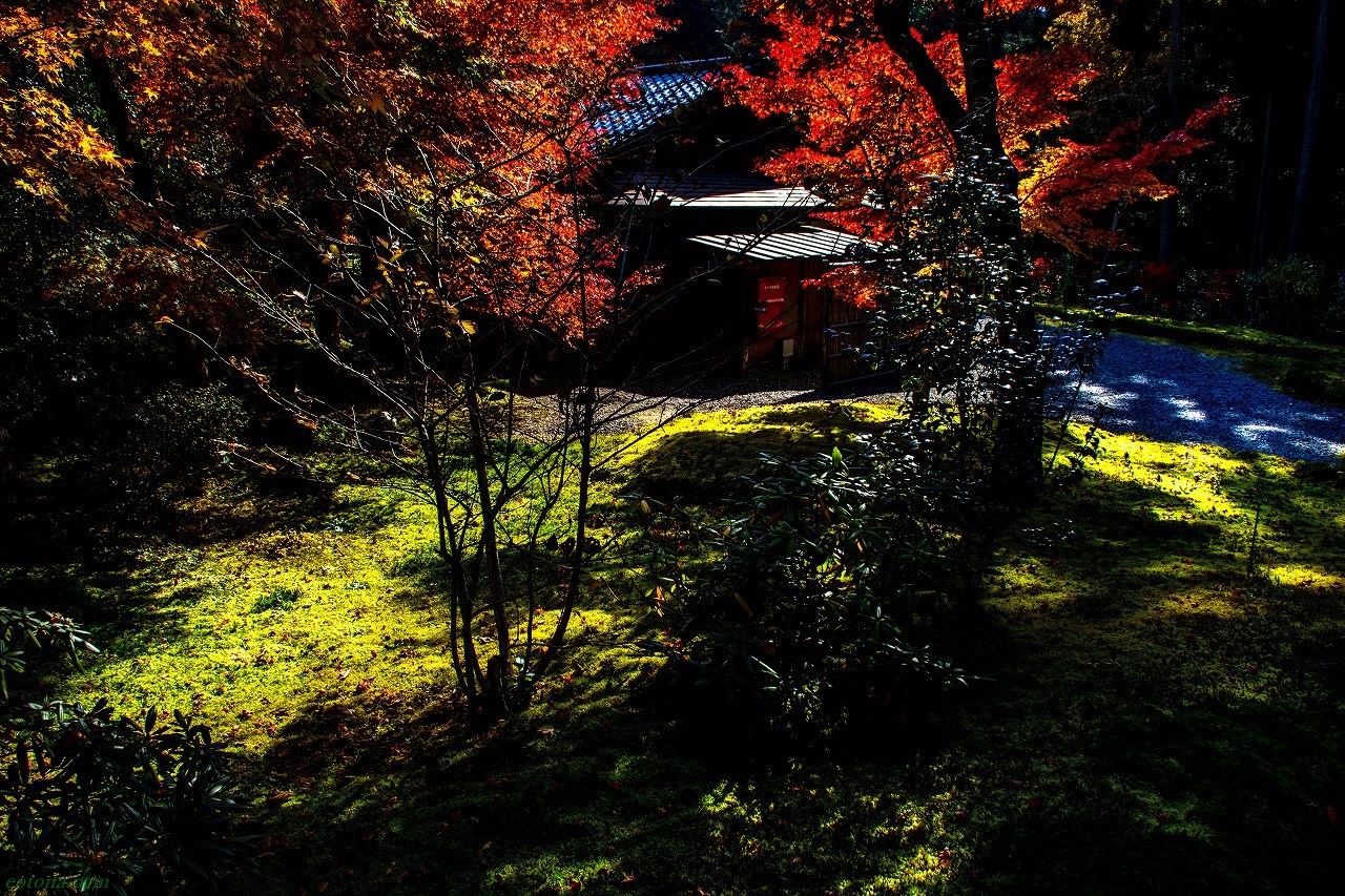 一面に苔の広がる枯山水庭園と、琵琶湖をイメージしたという池を中心とした池泉鑑賞式庭園。