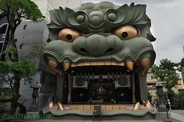 鳥居の外からも見ることができる大きな獅子殿は、「難波八阪神社」の有名スポット。