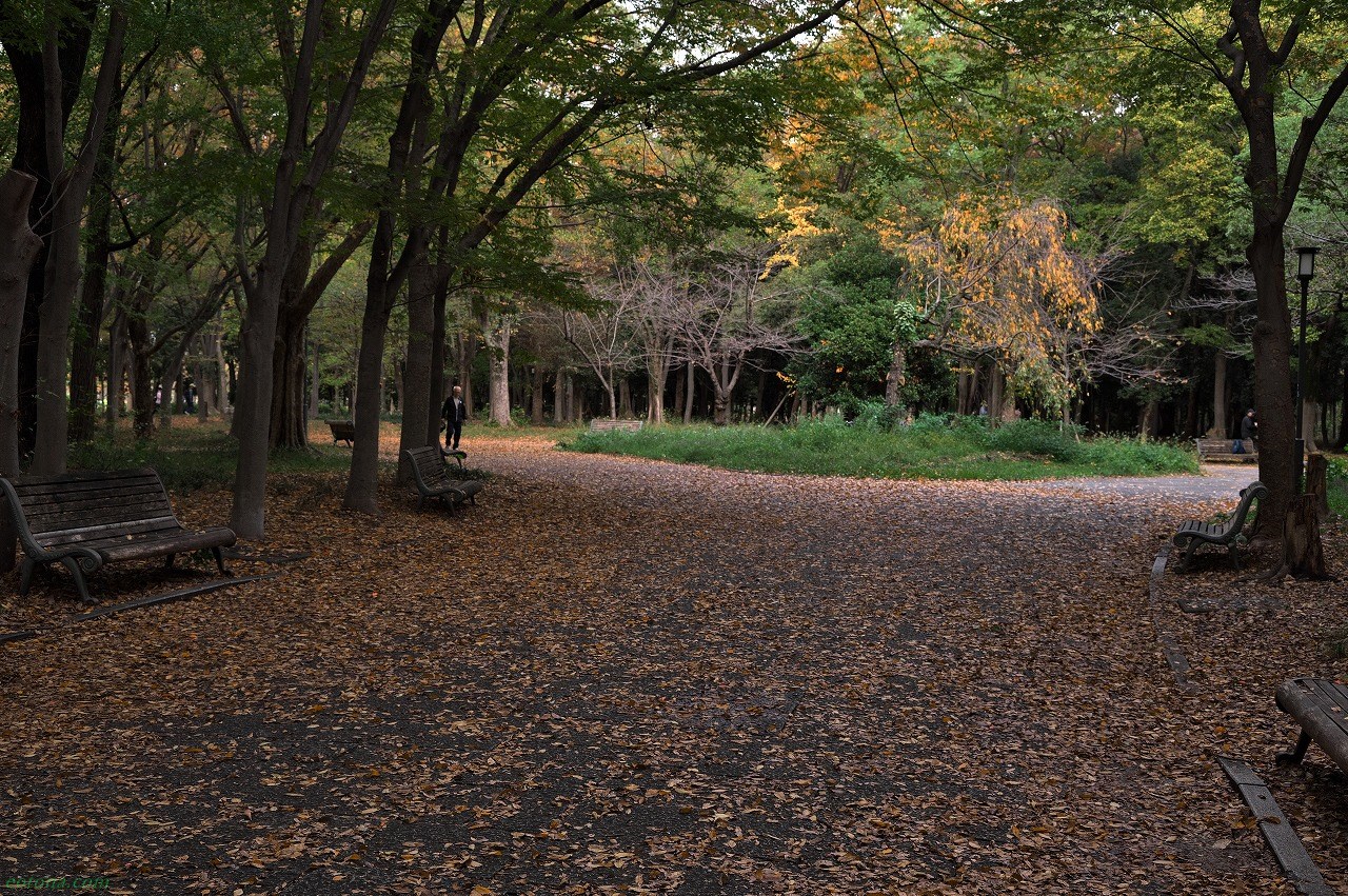 森はきれいに色づき、人々は思い思いに森を散策しています。