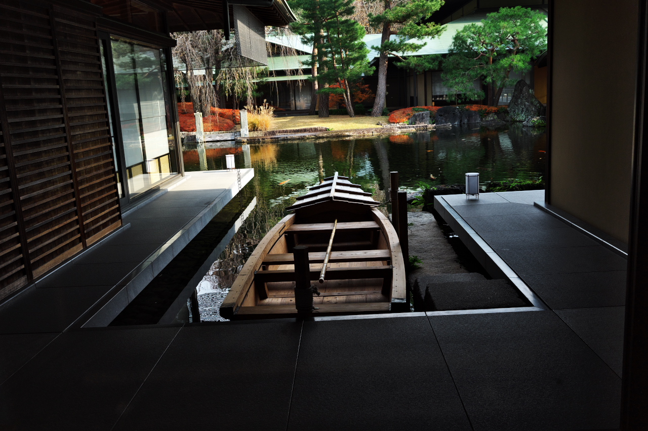 錦鯉が泳ぐ池に舟が浮かび、四季折々の庭園の彩りと調和する姿が見られる