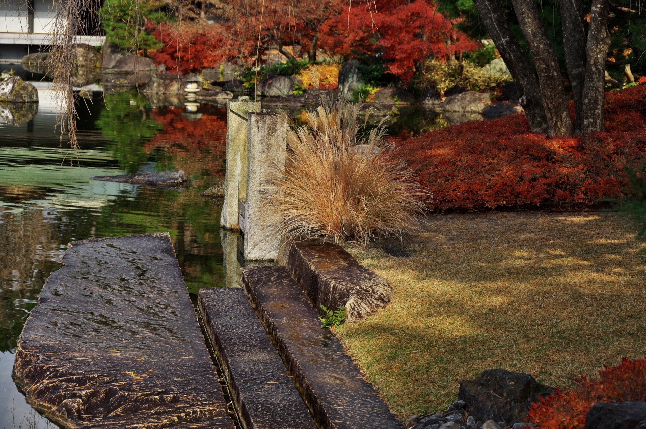 錦鯉のいる池、東西の建物を結ぶ橋は庭園の美しさを際立たせています。