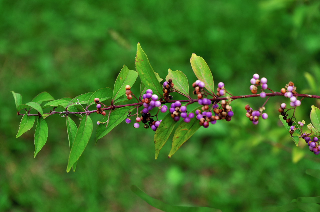 秋になると、小さな紫色の実をたくさんつける低木があります。