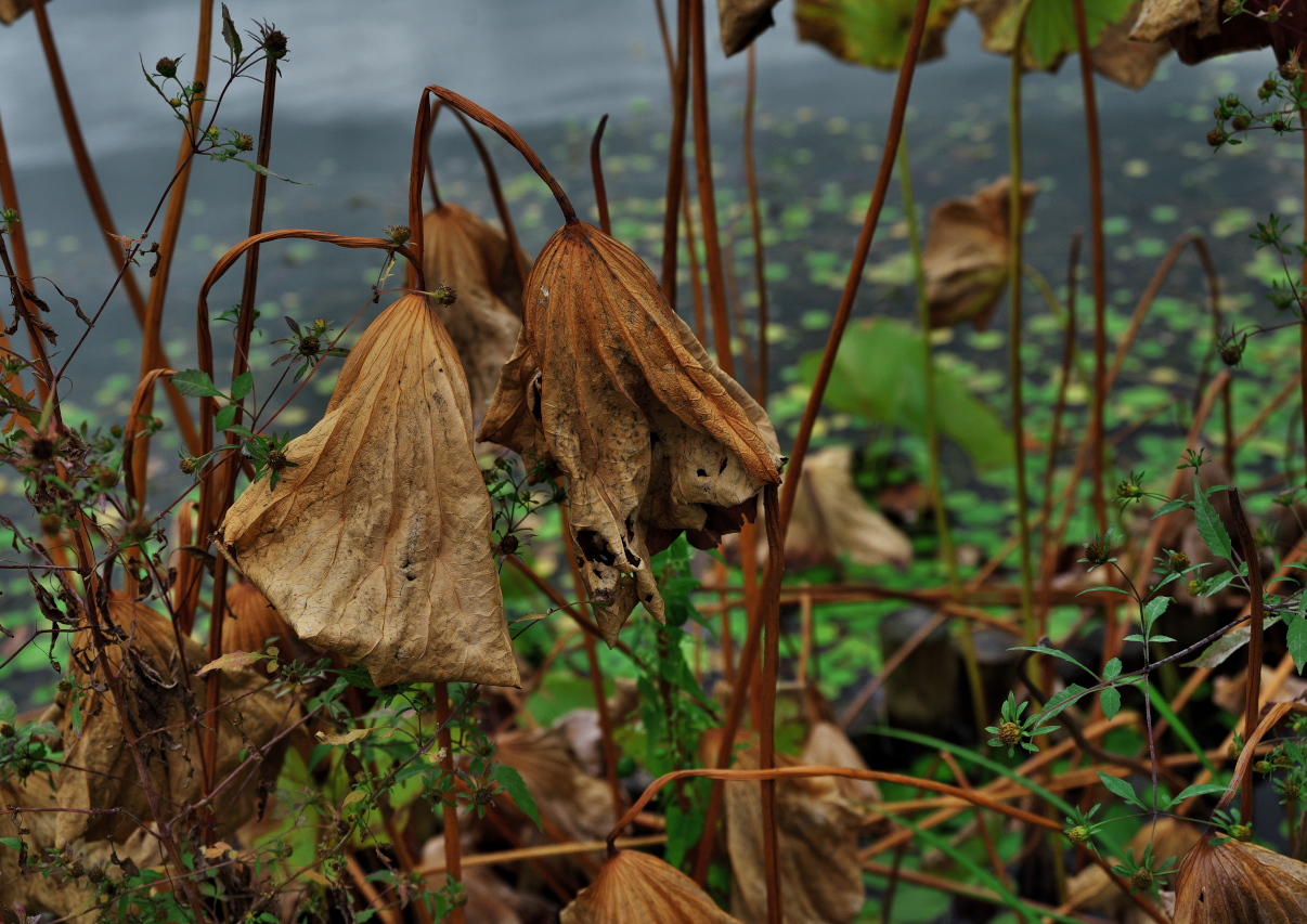 夏の間咲き誇った蓮の花が枯れて無残な姿をさらすギャップに心惹かれます。