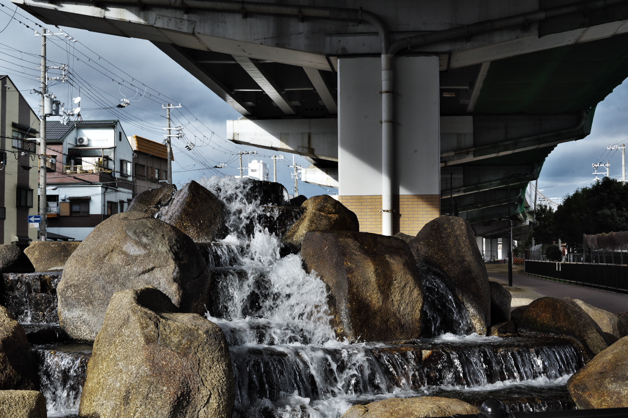 公園事務所横からは川の流れのように心字池に水が流れ、川の流れは周りの花や樹木の風景にリズムをつけています。
