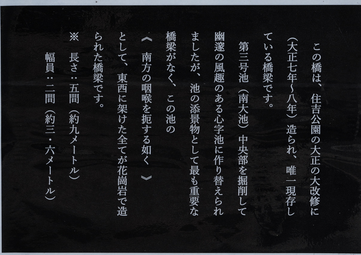 この橋は大正初期大改修に造られ、唯一当時のまま残されているもので、心字池の景観上重要な石橋です。