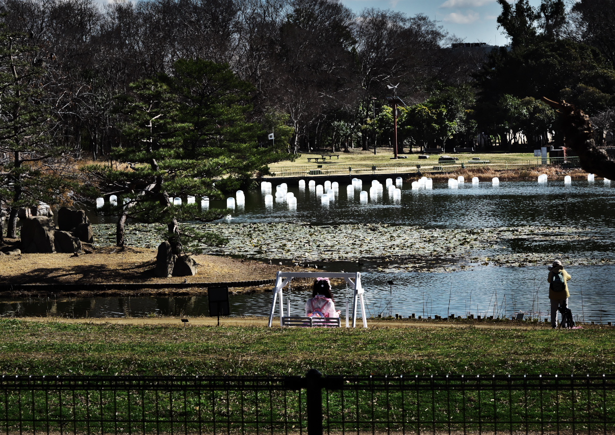 長居植物園、大池の様子が見えています、女性がカメラを設置して自撮りしています。