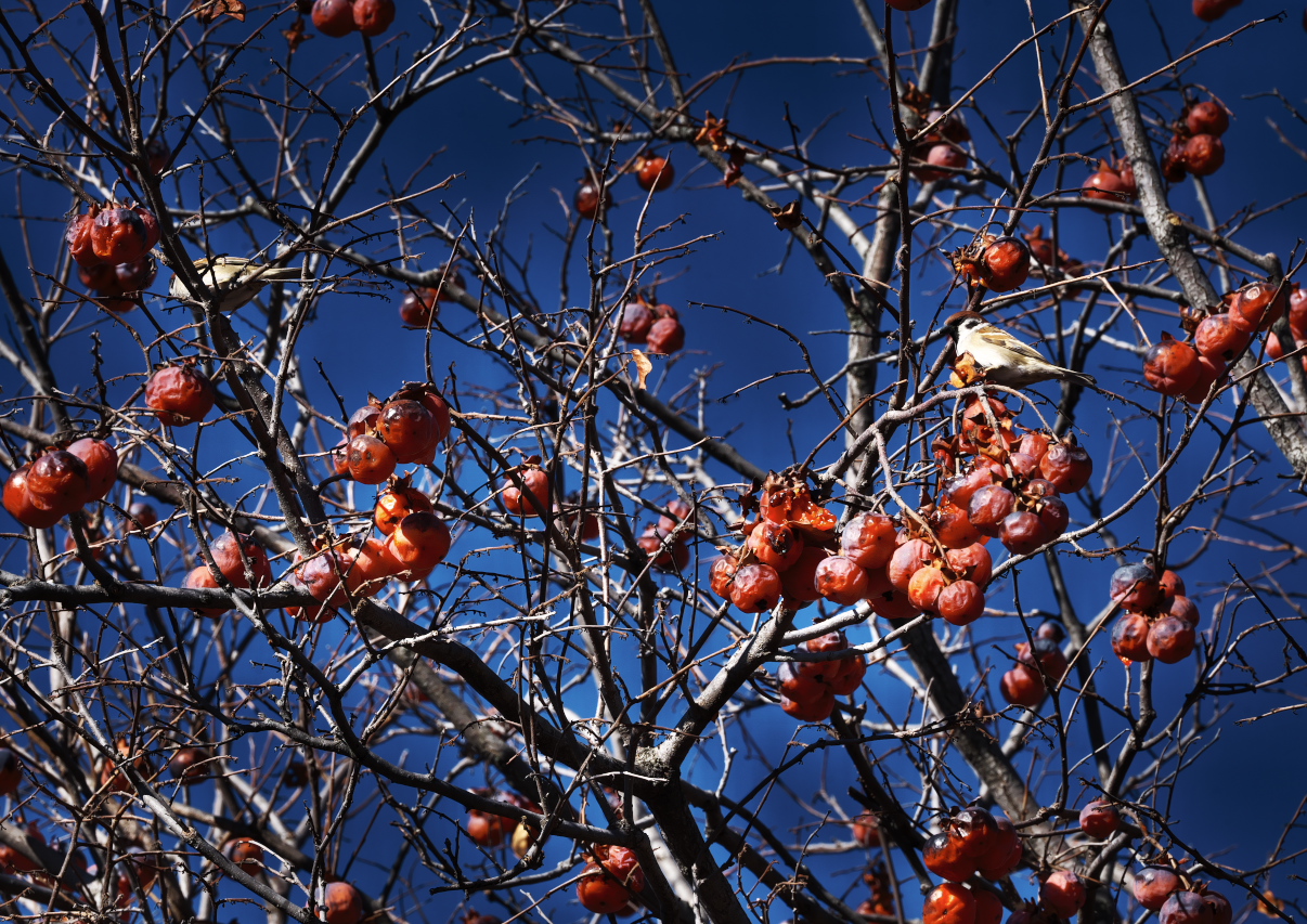 小鳥が木の実を啄んでいます、もしかしてメジロかな。