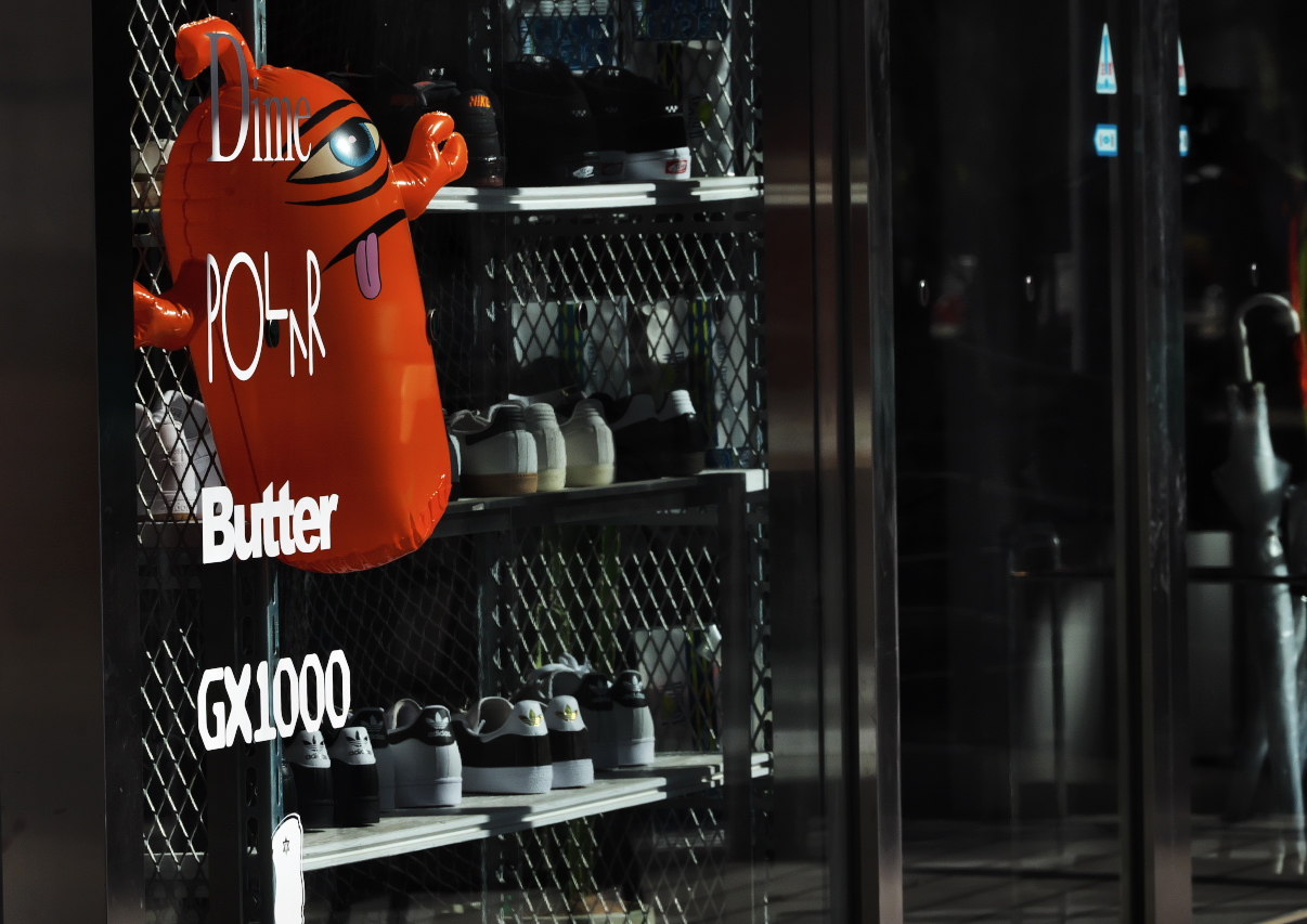 長居スタジアムの方向へむかう、スポーツ店なは運動用具が並ぶ。